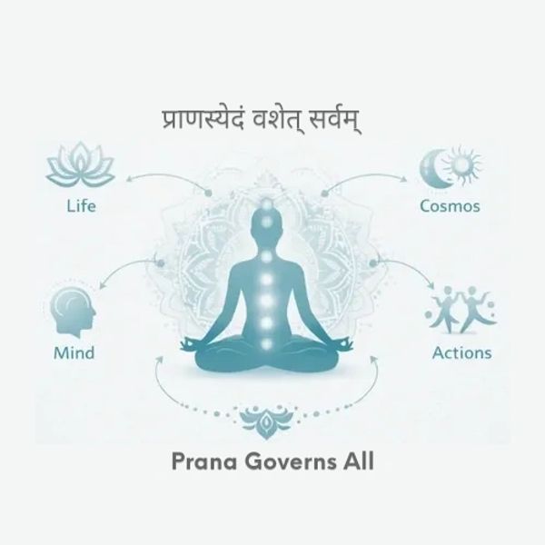 In yogic and Upanishadic philosophy, Prāṇa is not merely breath, but the fundamental universal energy that fills the body, mind, and cosmos with life. The phrase conveys the idea that mastery or balance of prāṇa leads to harmony and control over all aspects of life.